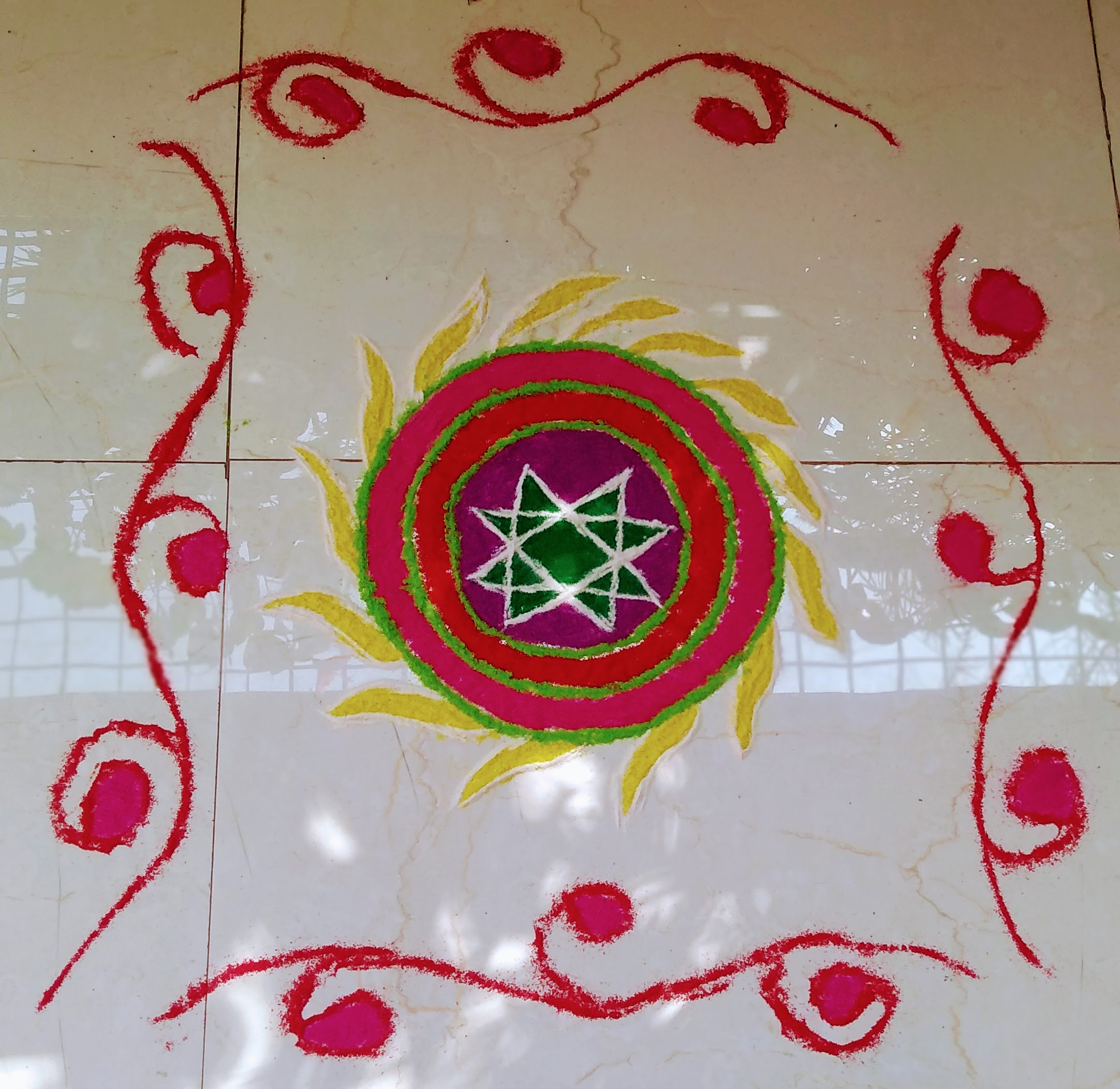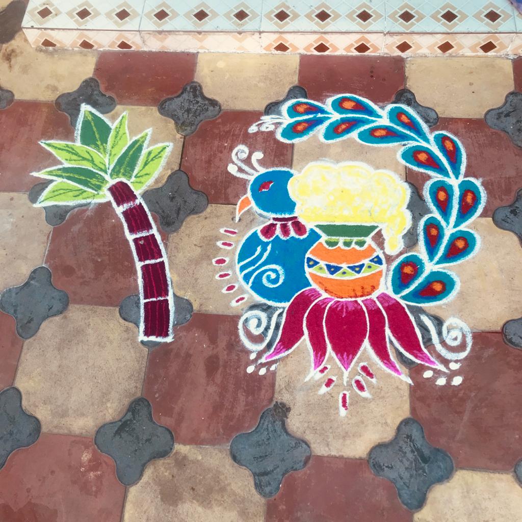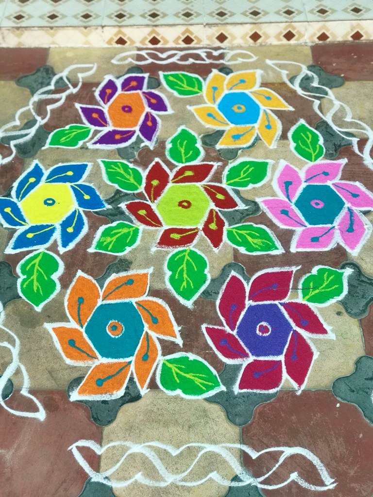 Rangoli or Kollam as it is called in South India is an art form, where we draw intricate and colourful patterns, flowers, or images on the floor with rice flour or chalk powder.